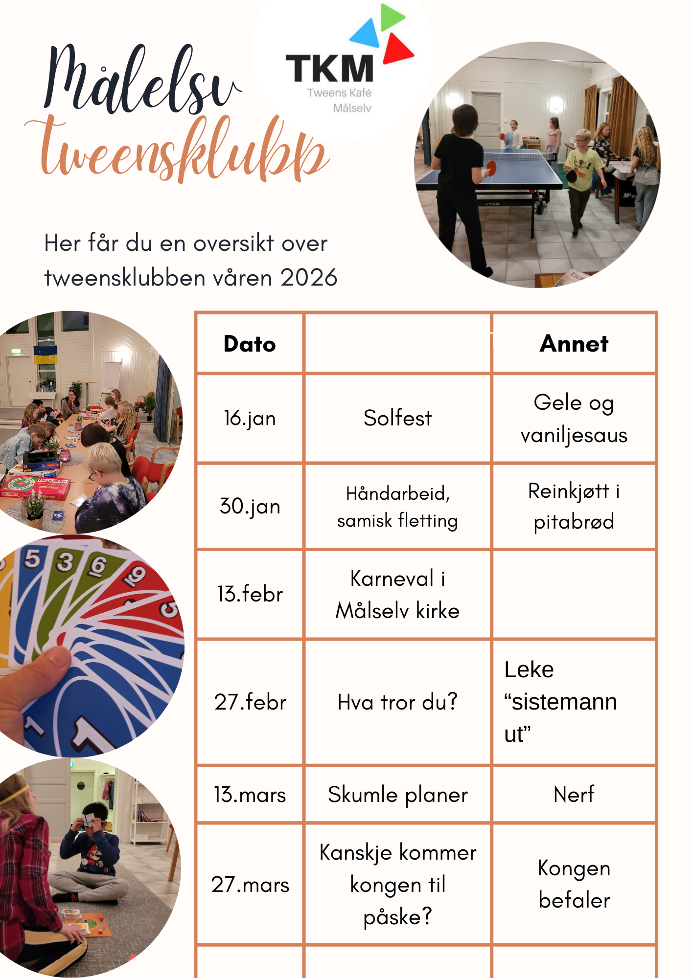 Målselv menighet og Misjonskirka har sammen startet en klubb for 5.-7. klassinger; Tweens Klubb (TK). Her kan alle som er BETWEEN, altså mellom barneskolen og ungdomsskolen, ha sin møteplass.